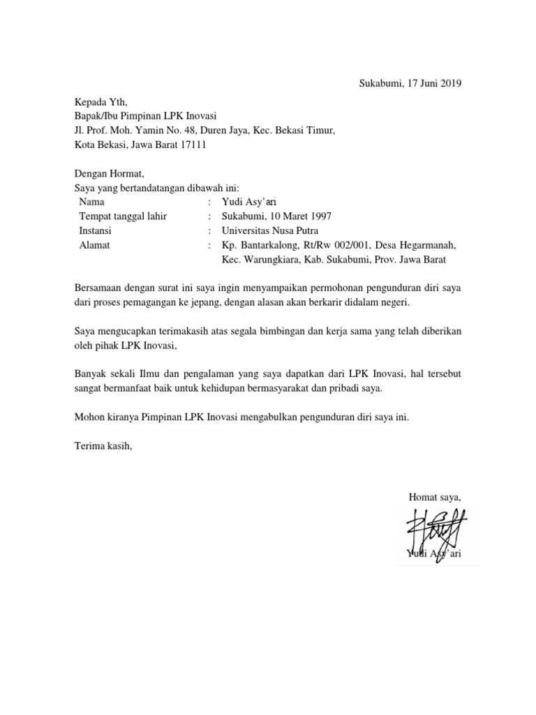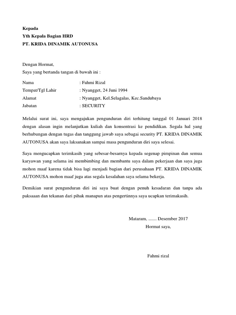 Lengkap dengan cara membuat surat pengunduran diri yang sopan dari perusahaan akan tetapi surat pengunduran diri dari kampus sedikit lebih rumit pada formatnya. Jika anda ingin mengundurkan diri atau resign dari kantor tempat anda bekerja sekarang, ada prosedur yang anda harus lewati. Download as pdf, txt or read online from scribd. Surat resign atau pengunduran diri merupakan surat resmi yang karyawan tunjukan kepada atasan langsung atau pihak hrd bahwa dirinya akan berhenti dari jabatan yang didudukinya di suatu perusahaan. #1 surat pengunduran diri dari perusahaan.